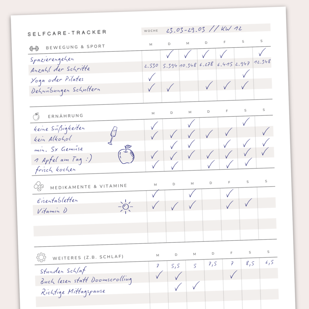 Was denkst du, wenn du diesen Habit Tracker anschaust? „Das hat ja nicht so gut funktioniert…“ oder „Nur 2 Häkchen…“? Grundsätzlich finde ich Habit Tracker total motivierend. Es ist ungefähr dasselbe Gefühl wie das Abhaken einer To Do-Liste, nur dass es eben jeden Tag wieder neu dran ist. Aber ein Habit Tracker ist eben gerade…