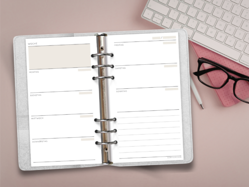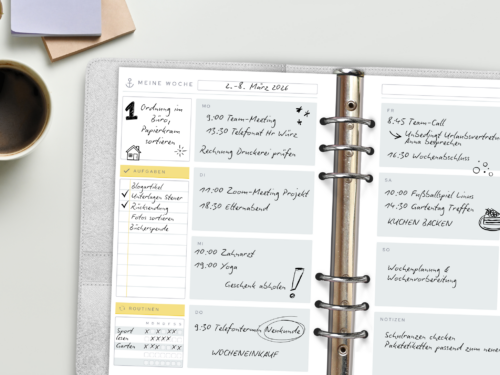 Auf sortierchen.de findest du Vorlagen zum Ausdrucken (printables), die sich flexibel kombinieren lassen und dich z.B. bei der Wochenplanung oder Wochenvorbereitung unterstützen. Ein weiteres wichtiges Thema: Menüplanung im Familienalltag. Die Frage „Was essen wir heute?“ einfach beantworten zu können, entlastet. Menüpläne gibt es auch als Notizblöcke in A4 oder A5, je nachdem, was am besten zu dir passt. Oder du ergänzt deinen A5-Ringbuchkalender mit schmalen Zusatzeinlagen, die auch gleich eine Einkaufsliste auf der Rückseite enthalten.