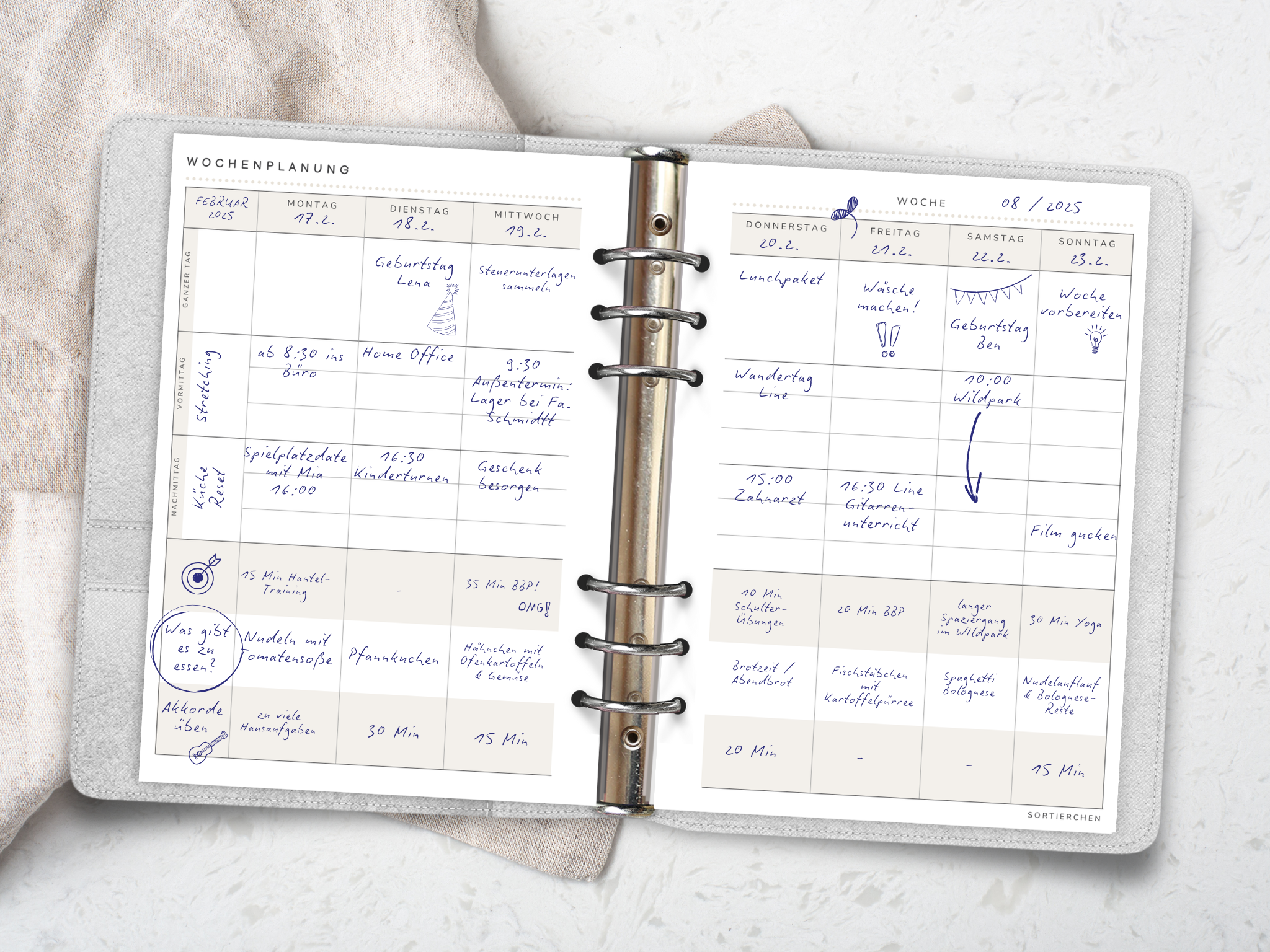 A5 Wochenplaner mit vertikaler Wochenansicht, 1 Woche auf 2 Seiten | flexible Zusatzfelder für z.B. Mahlzeitenplaner oder Symptomtracker | ideal für Familien, Alltag und realistische Planung.