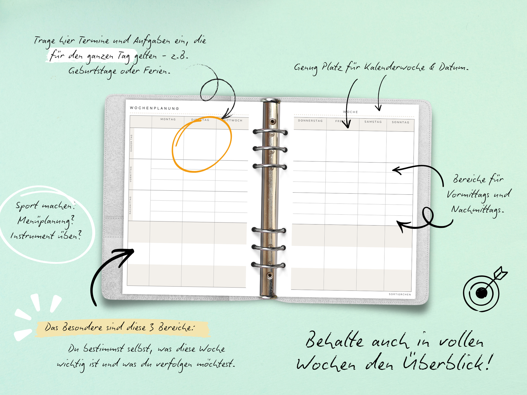 Ob Familie, Arbeit, Kindertermine oder eigene Ziele, du siehst alles auf einen Blick und kannst die unteren Bereiche genau so nutzen, wie es zu eurem Alltag passt. Und auch jede Woche anders.
