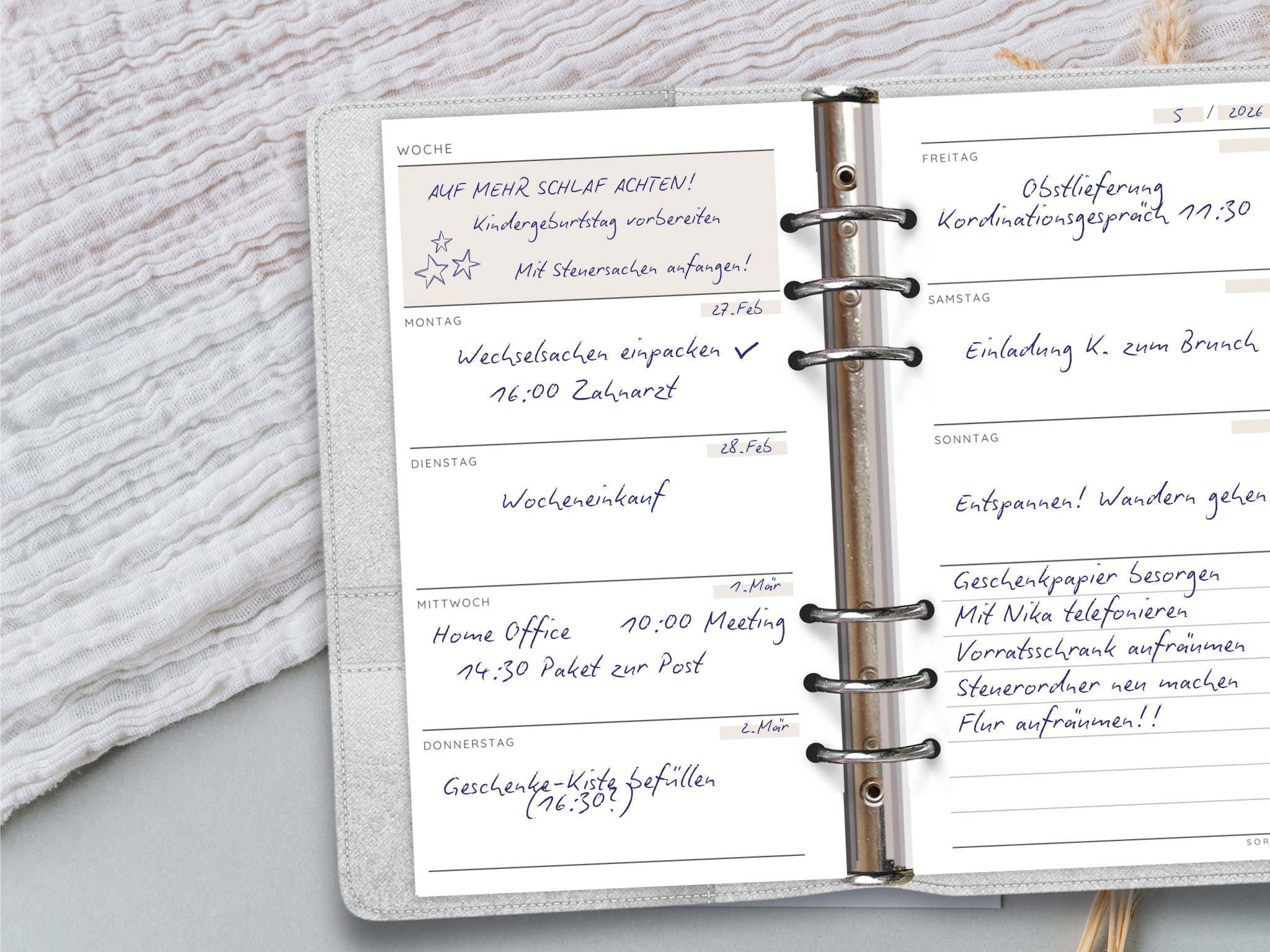 Du hast auf diesen Nachfüllblättern für deinen Ringbuchplaner nicht nur Platz, um deine Termine für jeden Wochentag zu notieren, sondern auch ein farblich hervorgehobenes Feld für die wichtigsten Dinge diese Woche.
