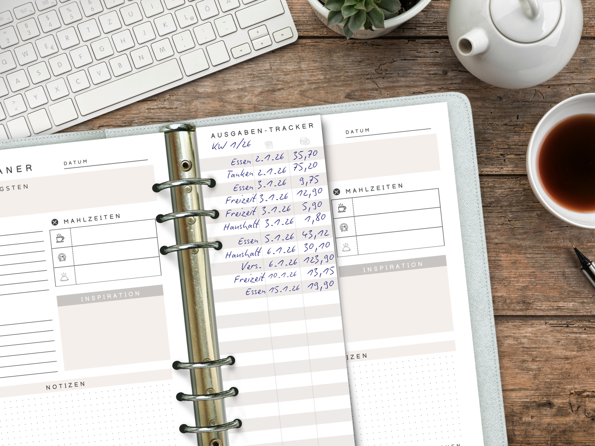 Behalte dein Budget im Blick mit diesen Zusatz-Planereinlagen für A5 Ringbuchkalender. Hier kannst du deine Ausgaben übersichtlich notieren: Kategorie, Datum, Betrag. Unten kannst du eine Summe zusammenrechnen.