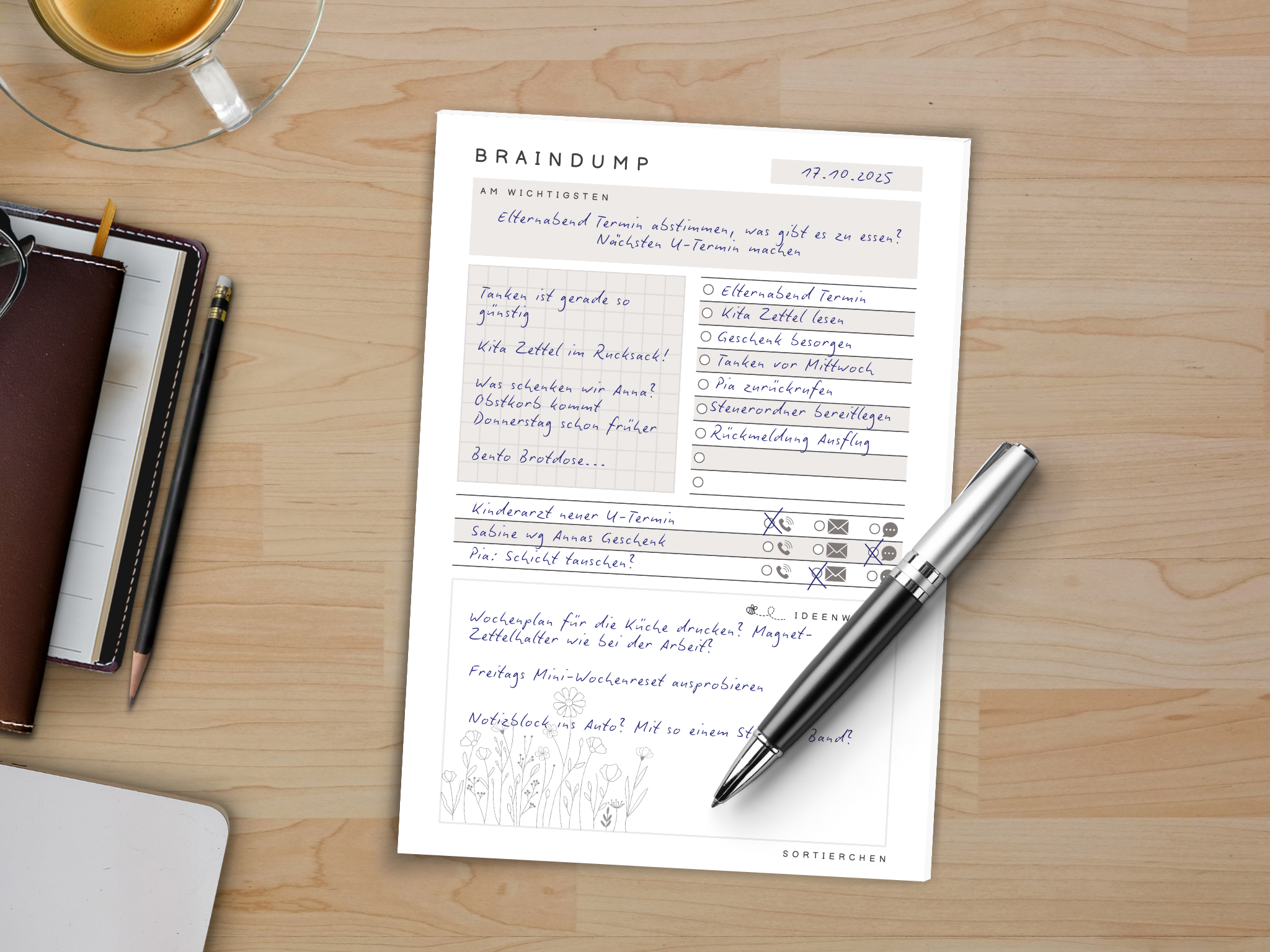 Dieser Notizblock hilft, wenn’s im Kopf zu wuselig wird, aber man keine Lust auf strikte Struktur hat. Einfach alles notieren, auslagern, durchatmen. Und sich später wieder drum kümmern.