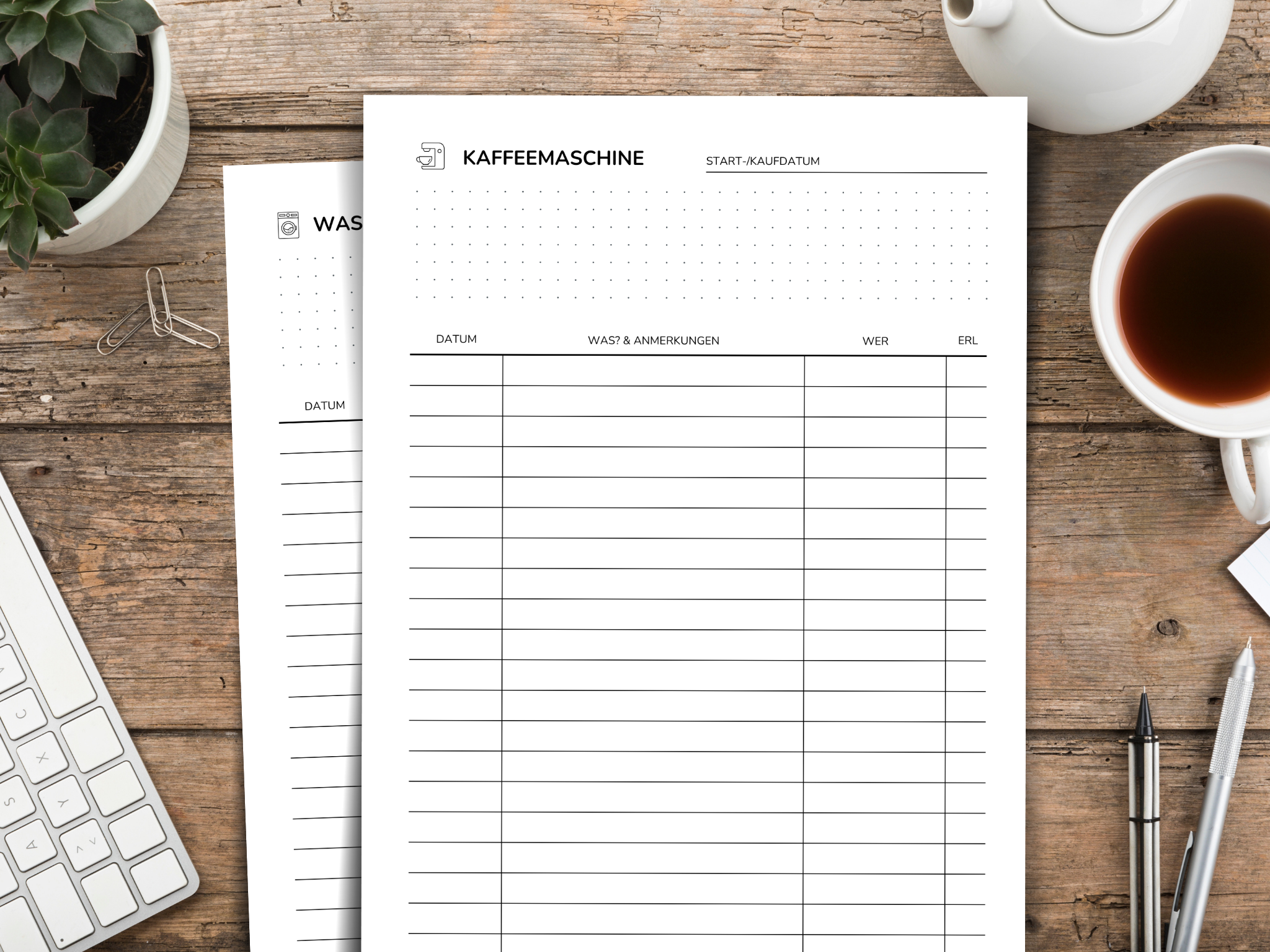 Mit diesem Bundle aus 12 liebevoll gestalteten Vorlagen behältst du die Pflege und Wartung eurer Haushaltsgeräte im Blick. Für jedes Gerät gibt es eine eigene Seite mit Platz für Kaufdatum, Service-Notizen und Zuständigkeiten.