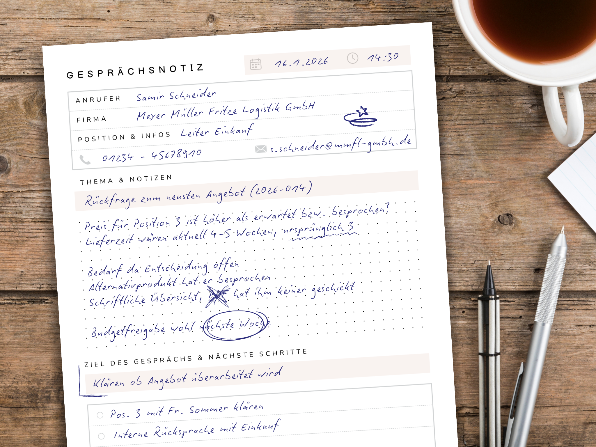 - Bullet Points für die To Dos, die sich aus dem Telefonat ergeben