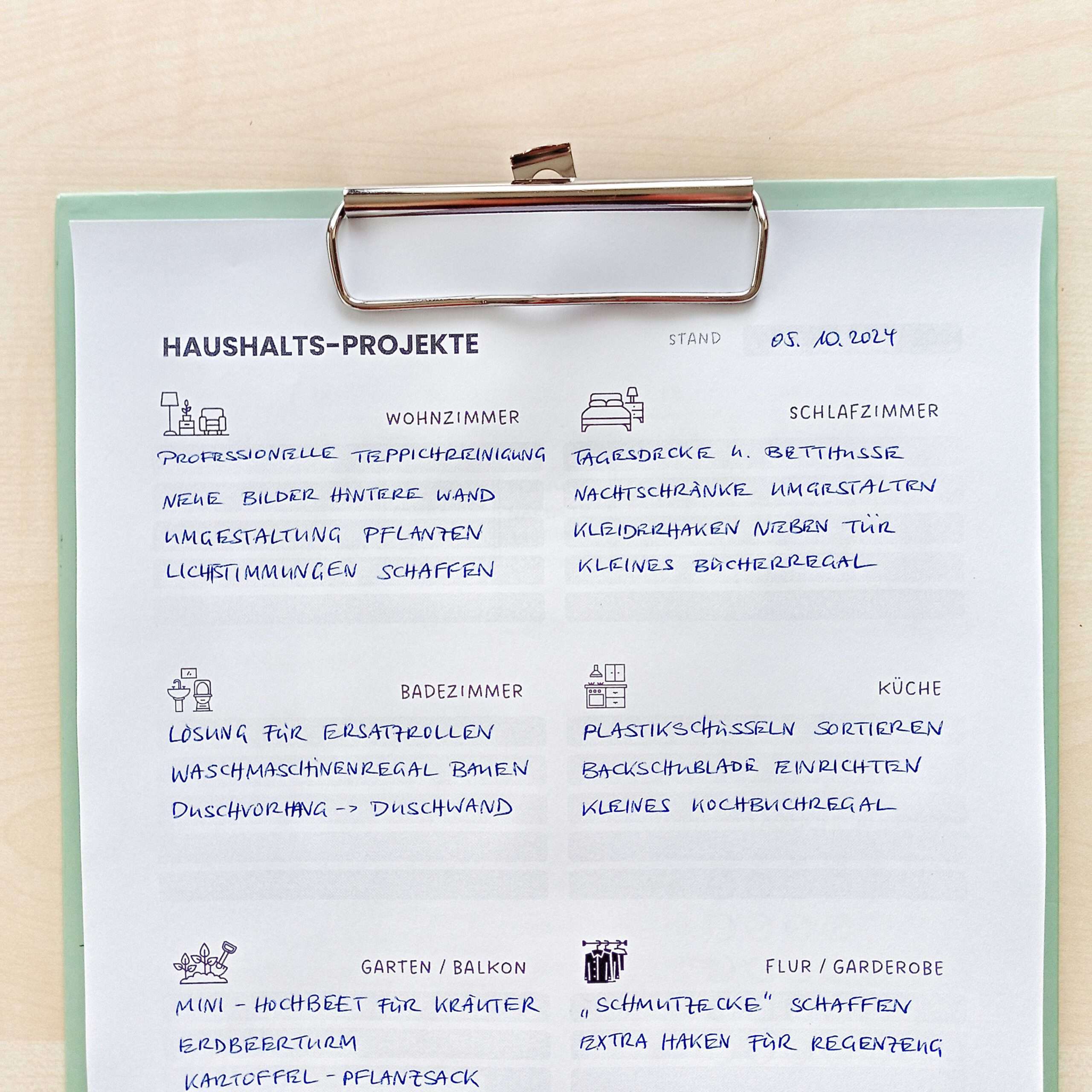 Ist die Garderobe immer unordentlich? Im Wohnzimmer ist es nicht so richtig gemütlich? Zeit für eine Umgestaltung! Auf dieser Vorlage kannst du für jeden Raum bzw. Bereich in der Wohnung Projekte notieren, die es umzusetzen gilt. Für Wohnzimmer, Schlafzimmer, Küche, Badezimmer, Balkon oder Garten, Kinderzimmer, Flur und Garderobe und das Büro (oder die Büroecke in einem anderen Raum).