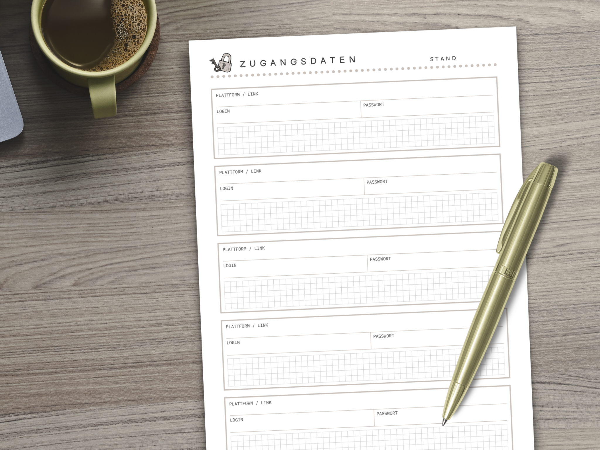 Passwort Liste & Digitaler Organizer | Passwort Tracker PDF | Vorlagen für Abos, Geräte, Cloudspeicher, Social Media | A4 Download