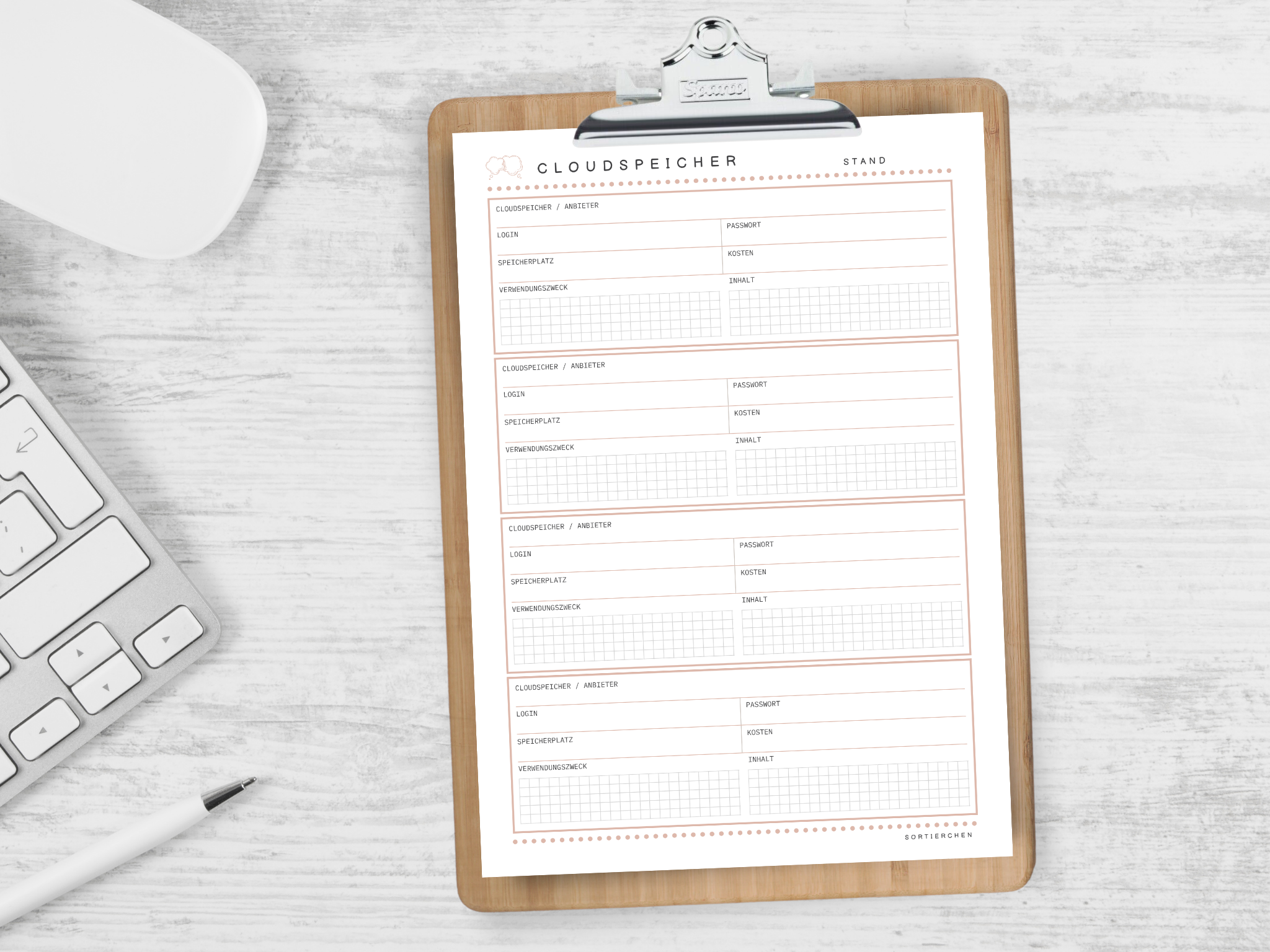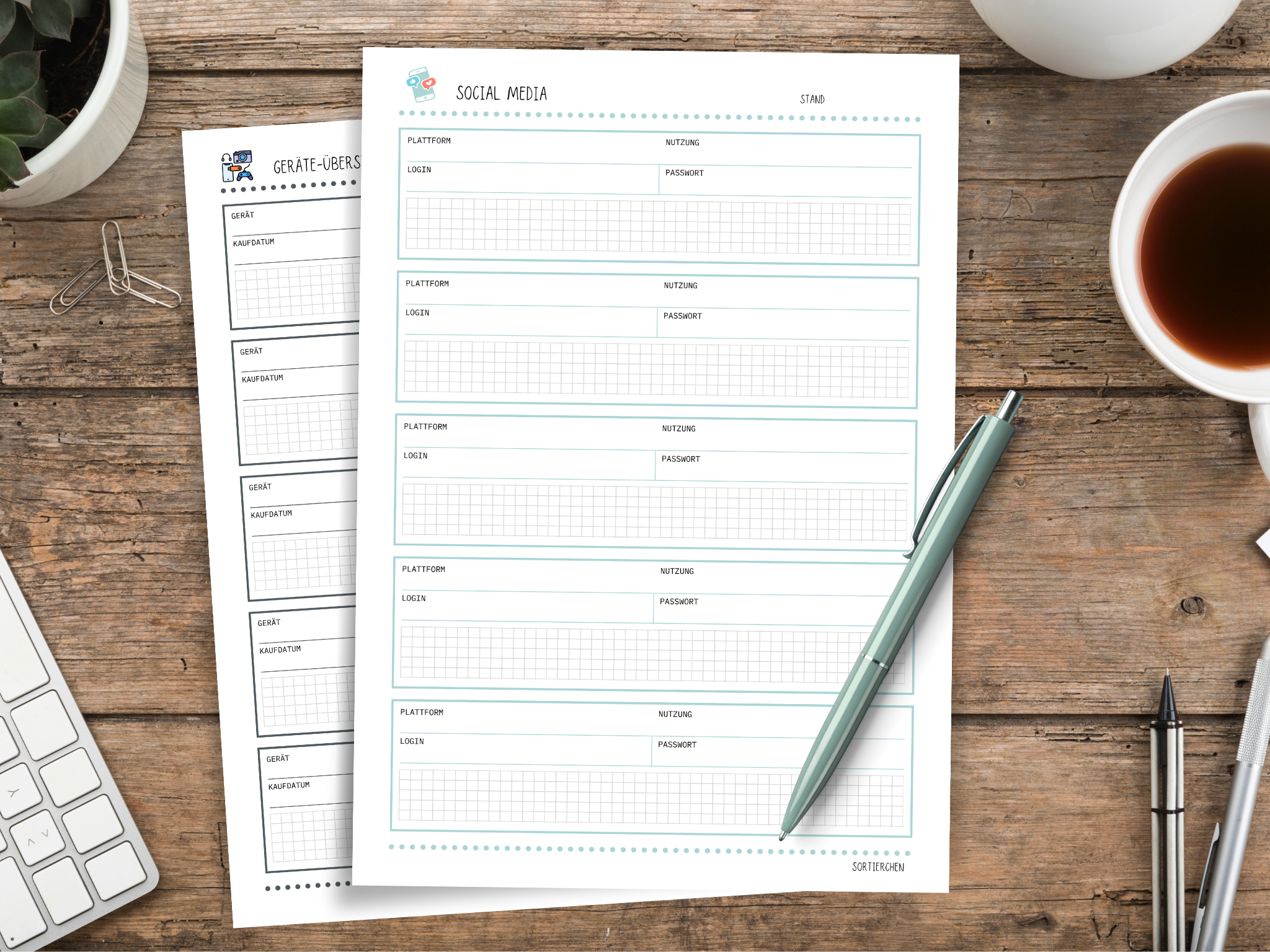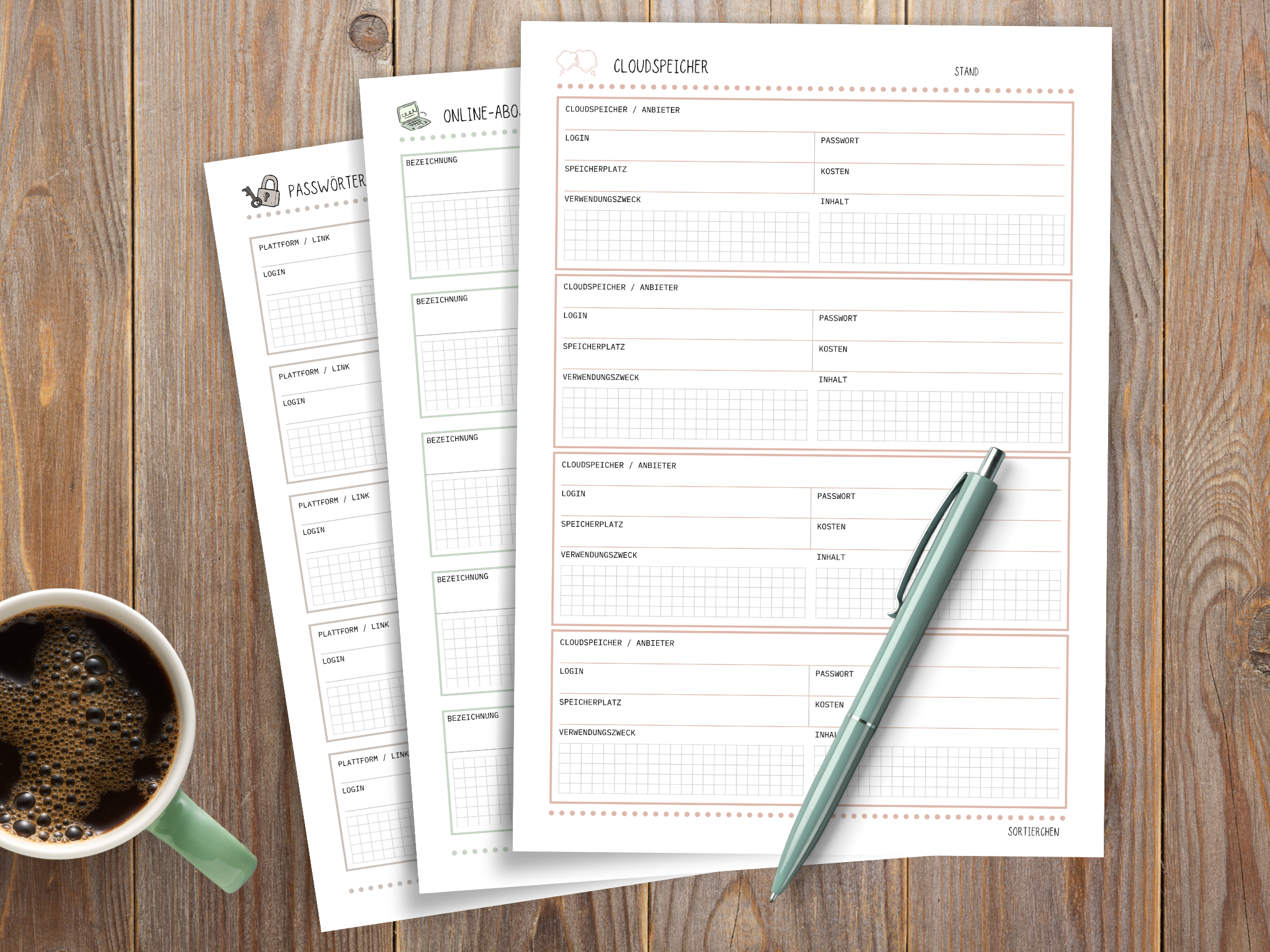 Passwort Liste & Digitaler Organizer | Passwort Tracker PDF | Vorlagen für Abos, Geräte, Cloudspeicher, Social Media | A4 Download