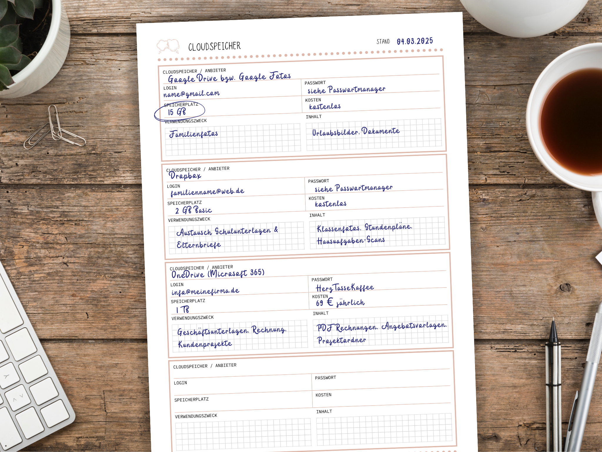 Mit deiner Passwortliste und dem digitalen Organizer sparst du dir Zeit, Nerven und Diskussionen. Alles ist übersichtlich an einem Platz.