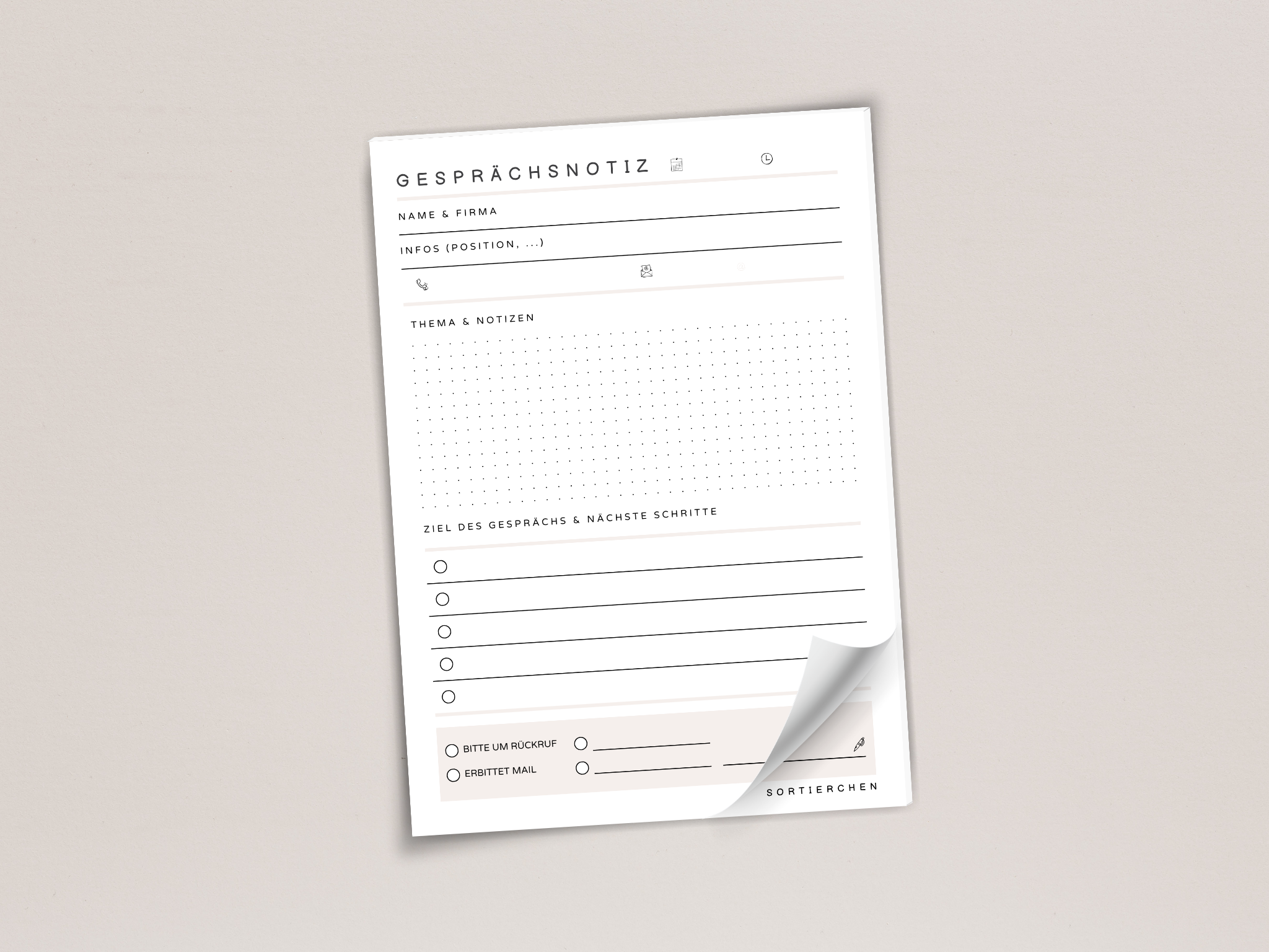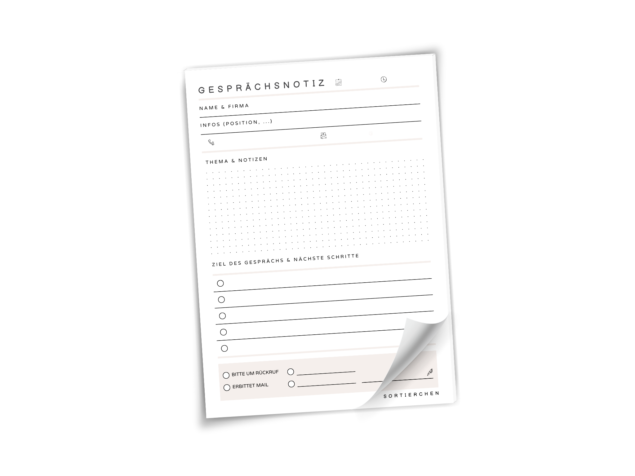 Mit diesem Block hast du jedes Gespräch klar festgehalten: Name, Firma, Uhrzeit, Thema und To-dos. Und wenn du mal für jemanden aus dem Team rangehst, kannst du das Blatt einfach auf den Schreibtisch legen. Verständlich, übersichtlich, sofort nutzbar.