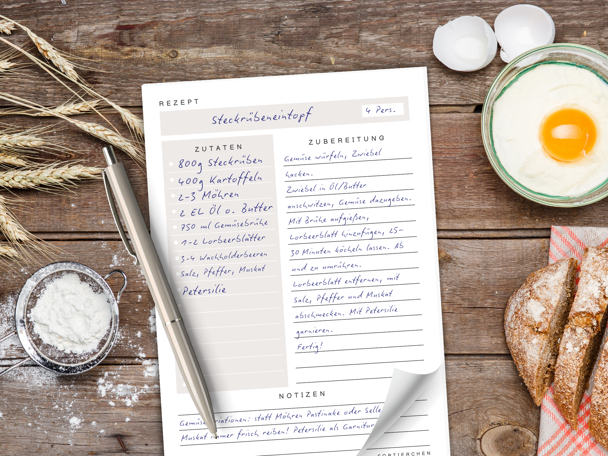 Am Ende gibt’s noch ein kleines Extra: Ein Feld für Notizen & Variationen – für Ideen wie: „Beim nächsten Mal weniger Zimt“ oder „Auch lecker mit Feta“.