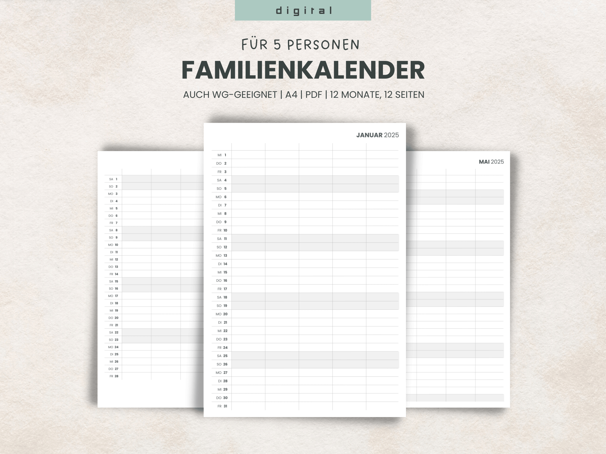 Schlichter Familienplaner oder WG-Planer für bis zu 5 Personen 2025 PDF A4
