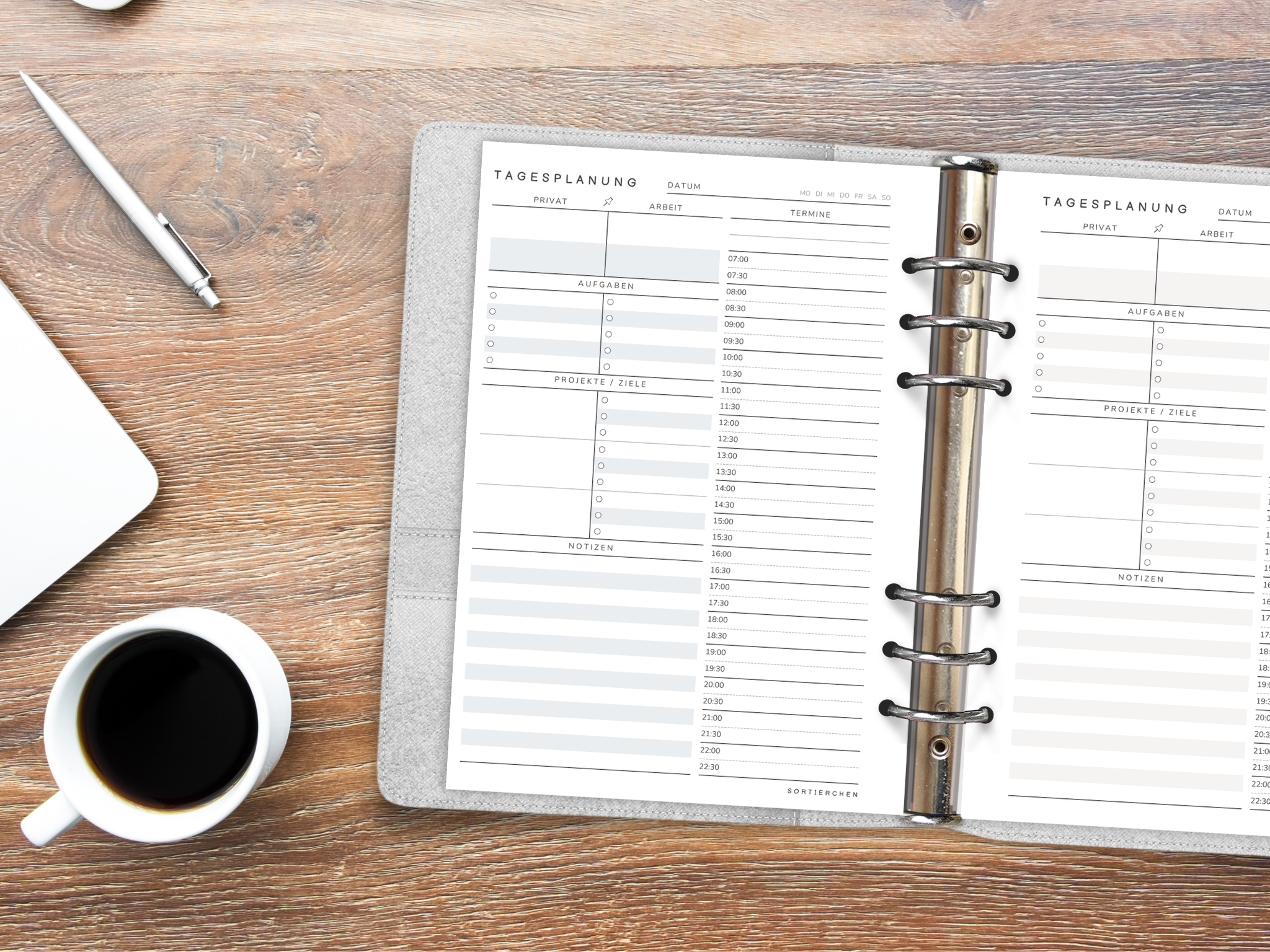 Diese A5-Tagesplaner-Einlagen helfen dir, Arbeit & Alltag in Einklang zu bringen. Egal ob Homeoffice, Familienchaos oder Kopf voller Projekte, mit dieser Vorlage bleibt der Überblick auf deiner Seite.