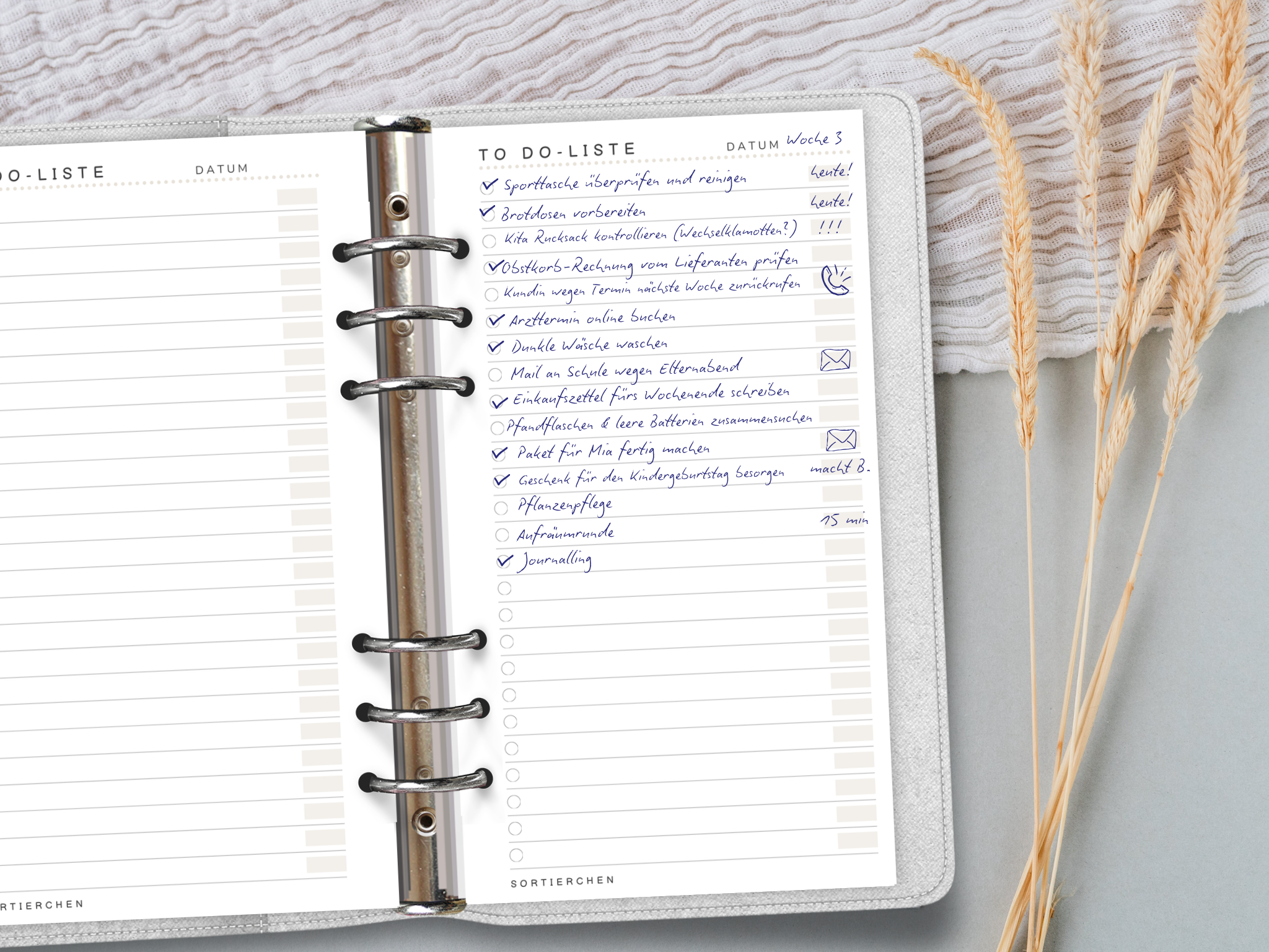 Am Ende jeder Zeile gibt es aber noch ein kleines Kästchen, in das du flexibel wichtige zusätzliche Infos einträgst. Du entscheidest, was dieses Kästchen heute für dich ist.