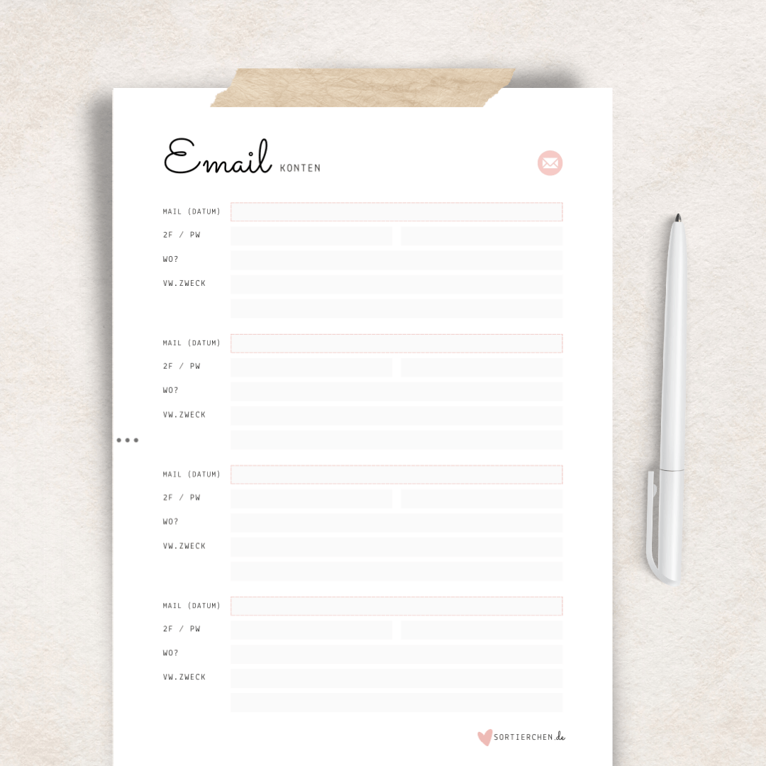 Auf dieser Vorlage sammelst du deine Email-Konten, inklusive Zugangsdaten und Verwendungszweck – z.B. „für Online-Shops“, „für private Dinge“, „für alles, was seriös ist“, „für Bewerbungen“, …
