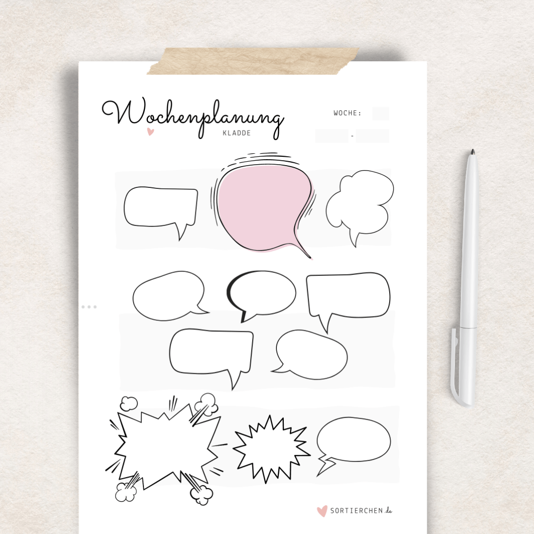 Diese Wochenplanung geht das Ganze ein wenig anders an und stellt dir drei Bereiche mit unterschiedlichen Sprechblasen zur Verfügung.