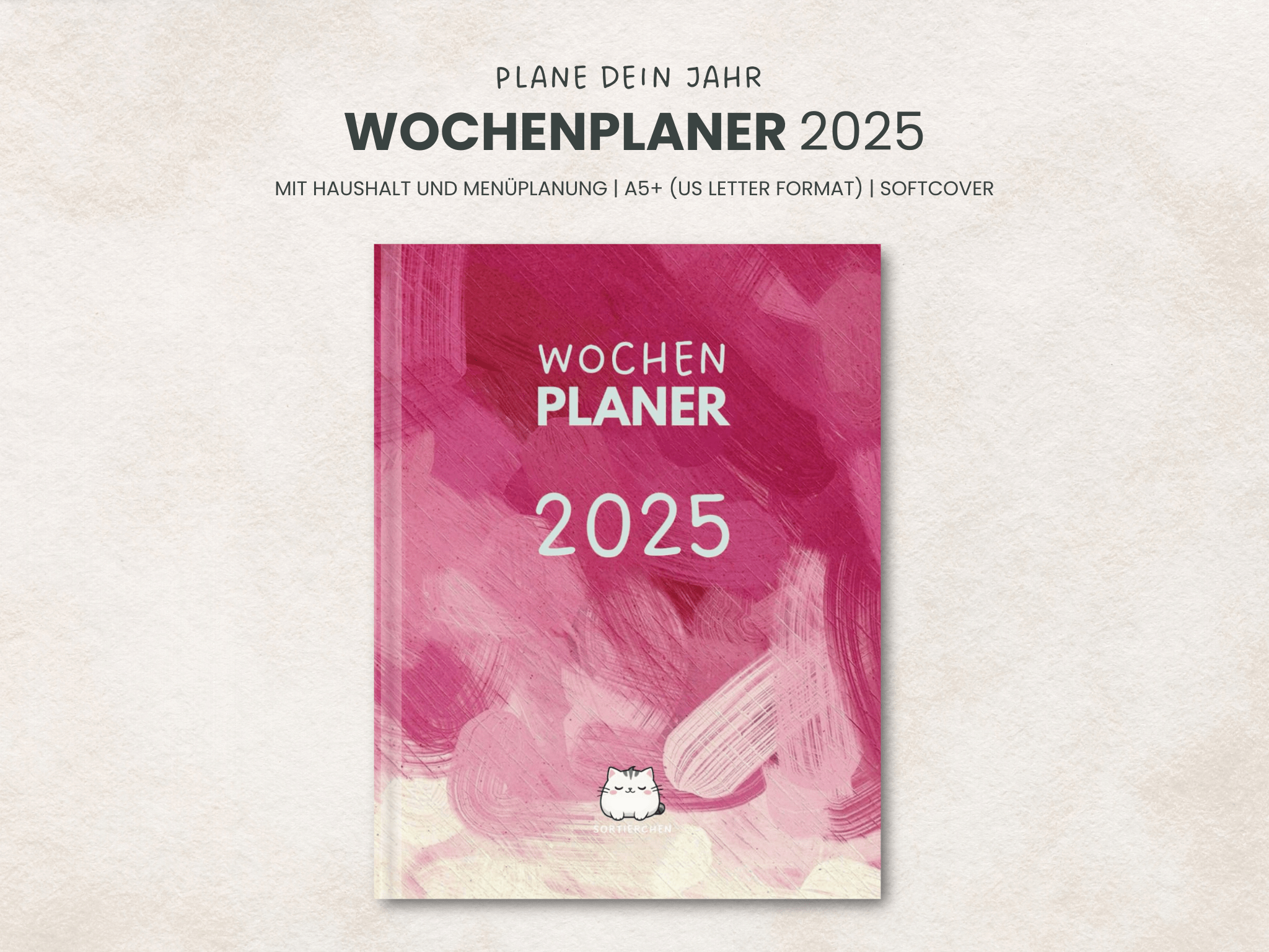 Umfangreicher Wochenkalender 2025 mit Haushaltsplanung und Menüplanung. A5+-Format, Softcover.