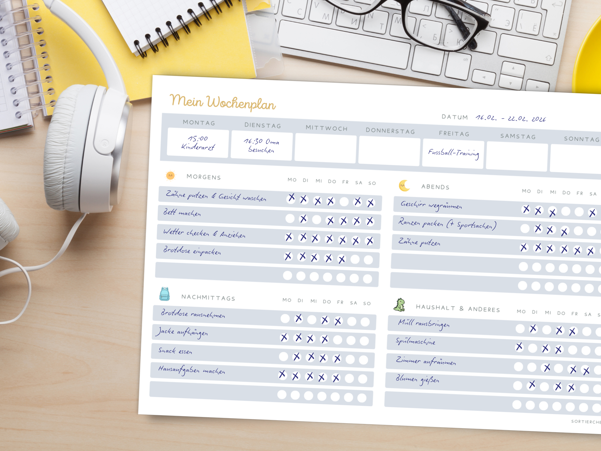 ✔ Abendroutinen – z. B. Geschirr wegräumen, Schulranzen packen, Zähneputzen