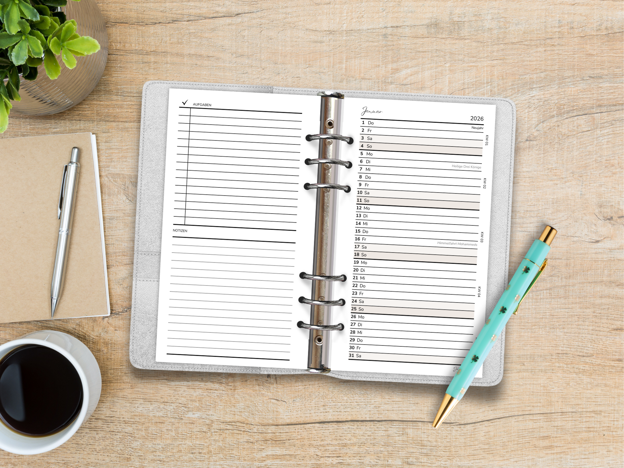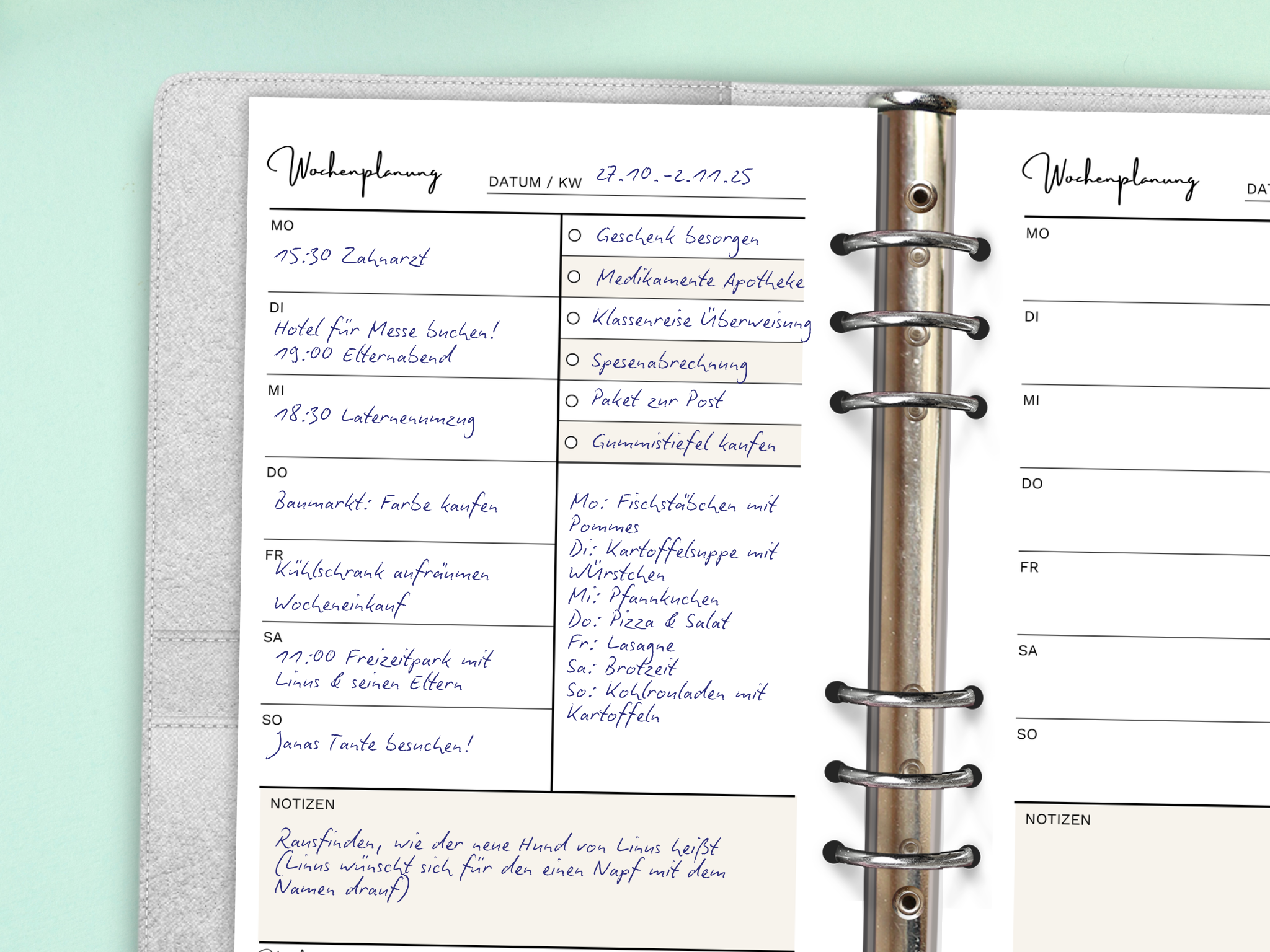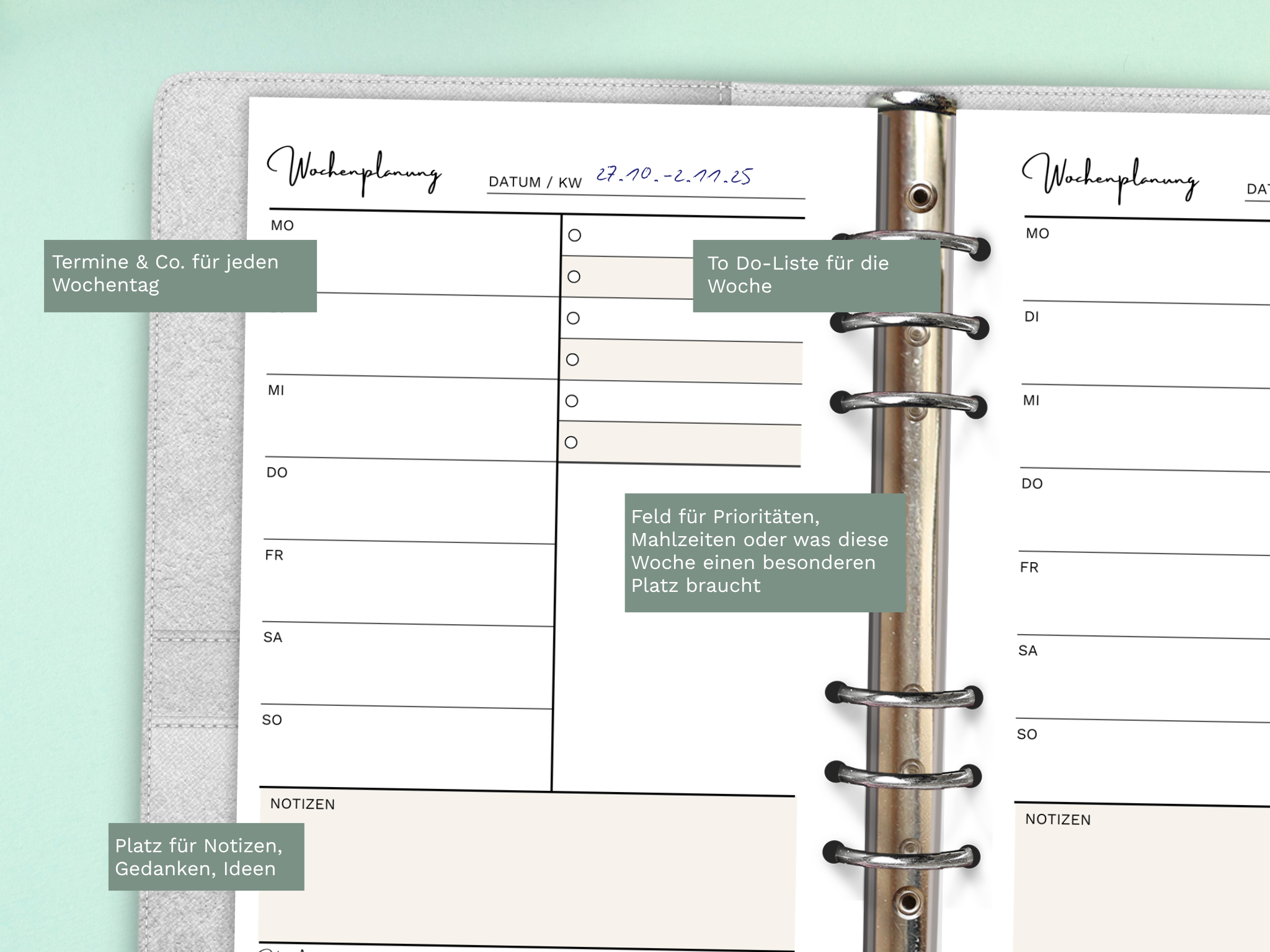 Die 26 Blätter sind doppelseitig bedruckt und 6-fach gelocht, passend für alle gängigen A5-Ringplaner. Du erhältst also 52 Wochenübersichten, perfekt für ein ganzes Jahr. Der schlichte, klare Stil passt sich deinem Alltag an, ohne zu überladen.