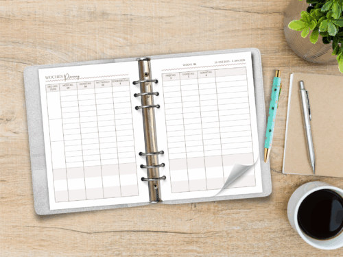 PDF Wochenplaner 2026 in sanften Boho-Farben. Vertikale Wochenübersicht ohne Feiertage, mit Extras für Fokusplanung. 107 Seiten, A5 zum Selbstdrucken
