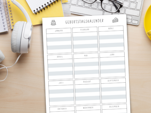 Immerwährender Geburtstagskalender zum Ausdrucken als A4 PDF mit zusätzlichem Geschenkideen-Planer für Familie, Kita oder Schule.