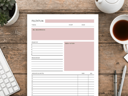 Projektplan Vorlage A4 mit Prio, Ressourcen, Nächste Schritte, Ideen/Notizen…